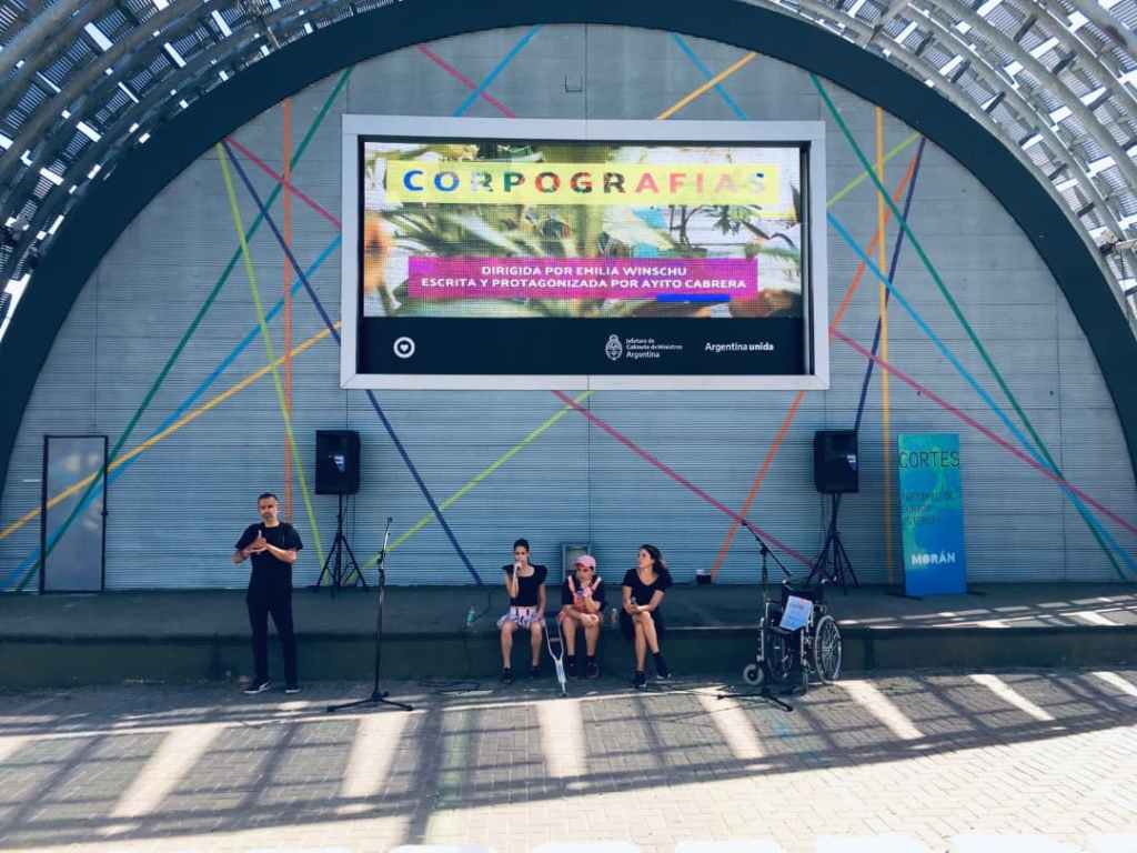 Presentación del cortometraje CORPOGRAFIAS- Ayito Cabrera, financiado por el Ministerio de cultura de la Noción del año 2021. En la presentación se solicitó a ANDIS, un equipo de interpretación en Lengua de señas Argentina. Se proyecto el cortometraje 3 veces, dado que estábamos en época de Covid-19, y teníamos que cuidarnos del virus. Luego, de cada proyección se realizó una charla sobre la accesibilidad, el protagonismo de personas con discapacidad, en el arte.