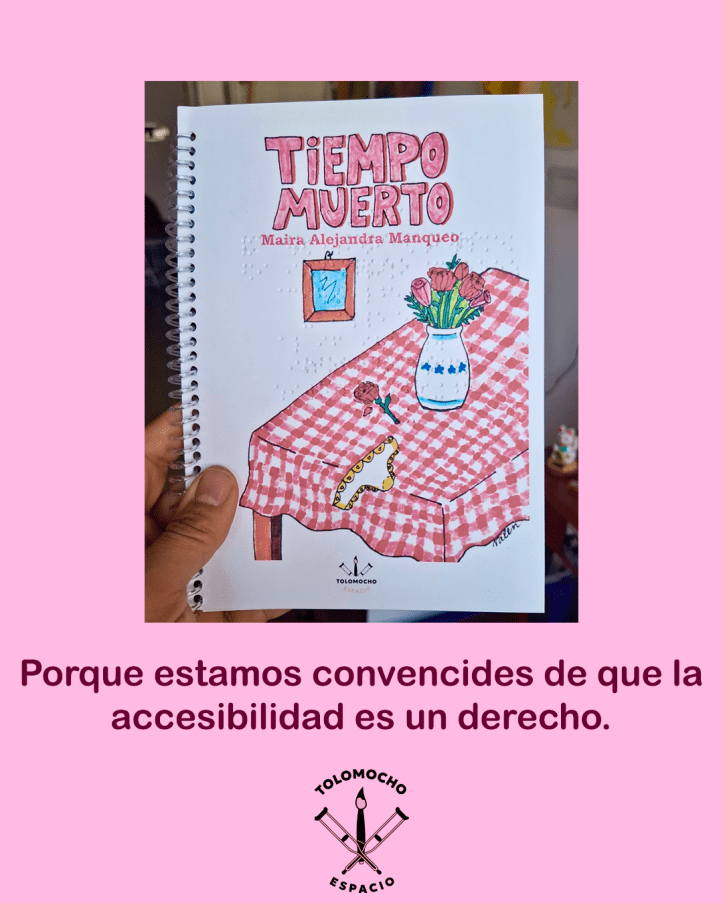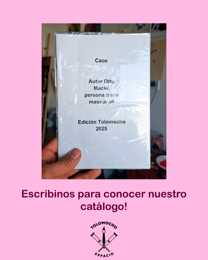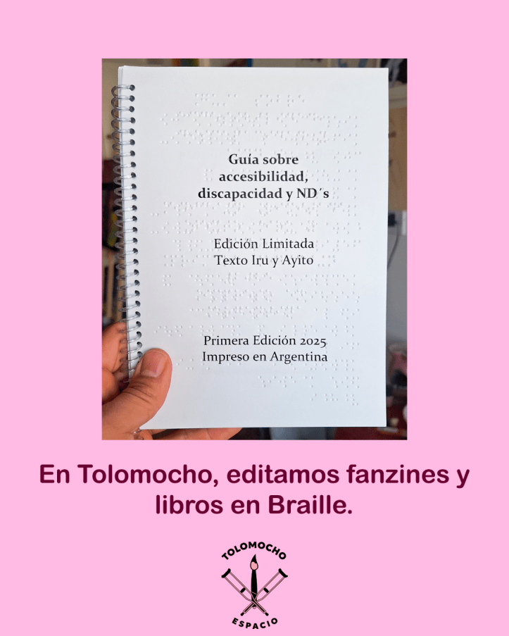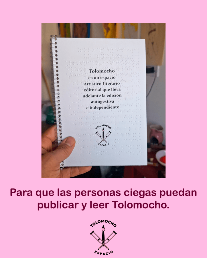 Desde Tolomocho creamos comunidad, los, las les, autoris se acercan al Espacio queriendo escribir, encontrar su voz entre tanto caos y capacitismo. Una vez avanzado el trabajo, se le ofrece cultiminar el proceso con un fanzine o libro, según la demanda de cada une. Luego, se maqueta, se diseña, se ilustra, y se imprime. La gestión es realizada toda por las personas del equipo. Una vez hecha la producción el siguiente paso es empezar a accesibilizar, hacemos QR con audios, y también difundimos en Braille.