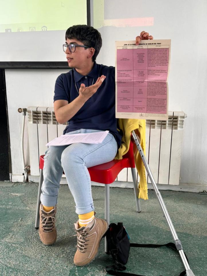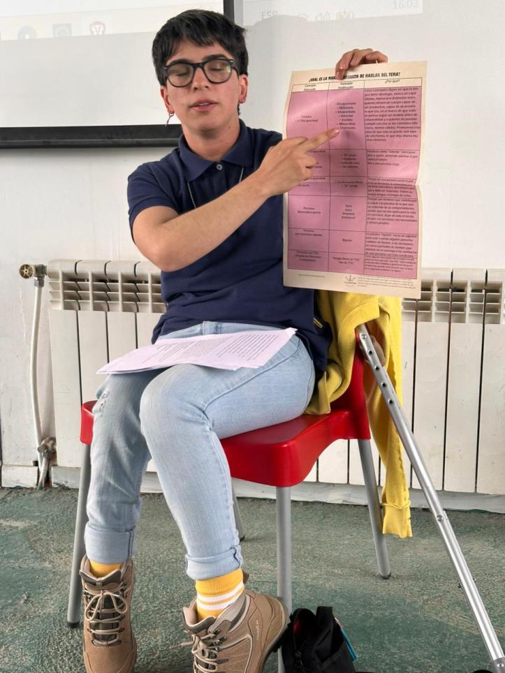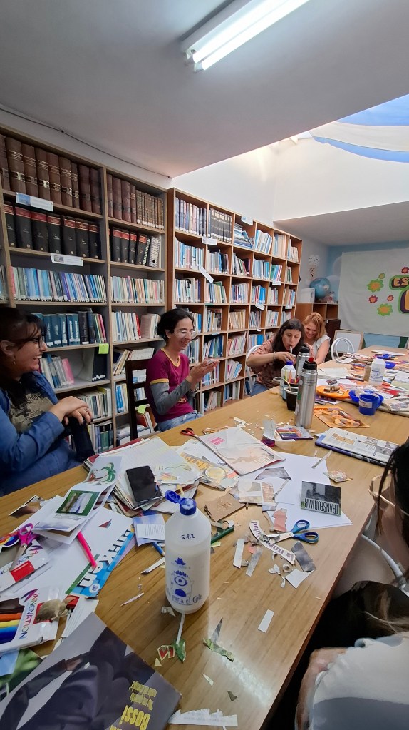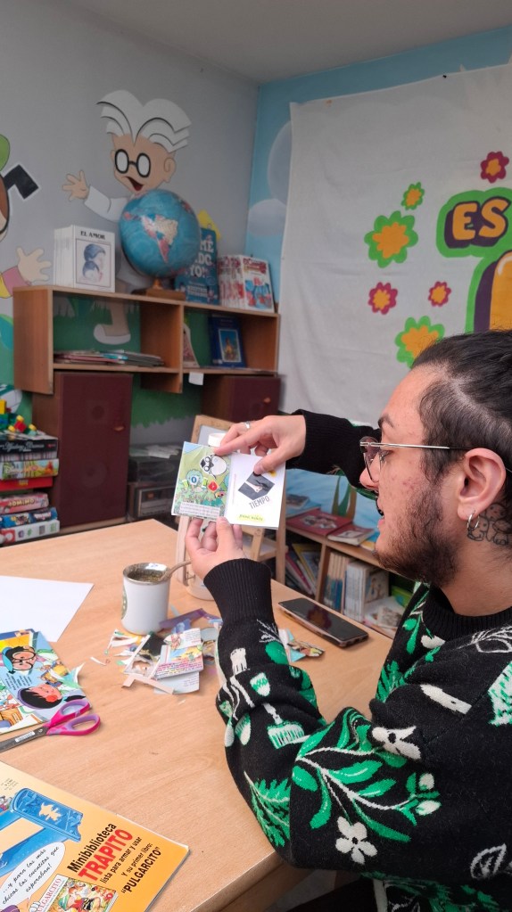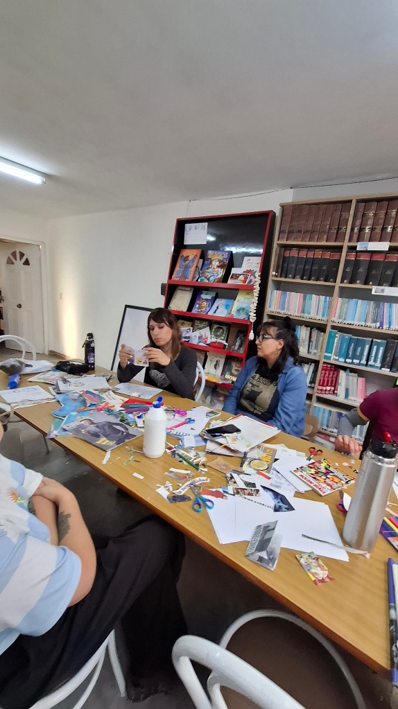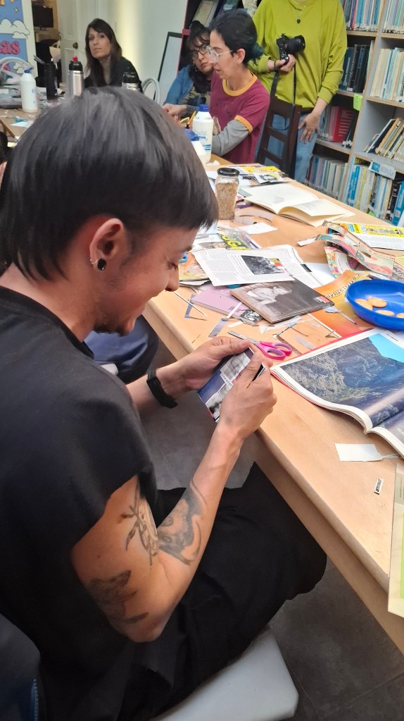 Además, participamos en un recorrido por la Biblioteca Infanto Juvenil de Río Grande para dejar nuestros materiales: libros como «Como si tuviera que pagarle con mi tristeza» de Ayito Alex Cabrera, «Memorias de un transexual» de Otto Maciel y «Rayo Violeta», un libro sobre intersexualidad y discapacidad; fanzines en Braille y la guía sobre discapacidad y neurodivergencia. También efectuamos un taller de fanzines para la comunidad, una oportunidad para explorar la creación como herramienta de expresión, memoria y acción colectiva.