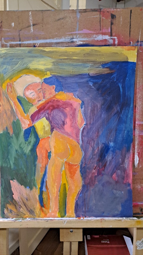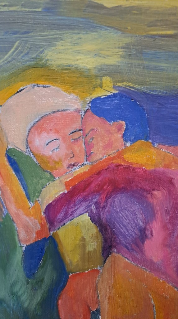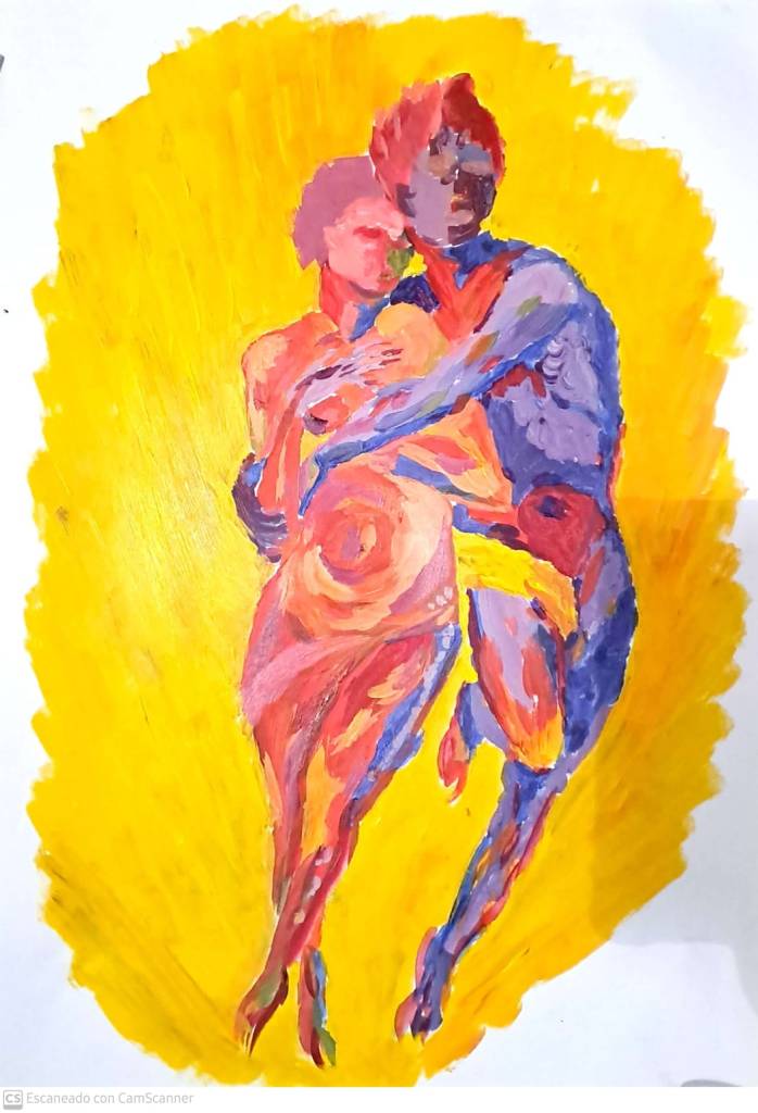 Obra de 35 x 50 acrílico sobre papel. Representa el encuentro de dos cuerpos diversos huyendo de la desidia de la discriminación del mundo exterior.